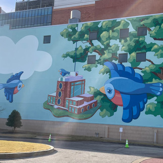 Another thing I like about Memphis is the trees. There are tons of trees in the midtown area of Memphis. Just for fun, I will pop out of the tunnels and run around with the squirrels. They get a little confused, but I can stand tall like they do and eat nuts too! Running around above ground I came across a sweet mural outside Le Bonheur Children’s Hospital. I could smell barbecue in the air. I followed the delicious smoke aroma and wouldn’t you know there was a mural on the side of the restaurant. Memphis murals everywhere!